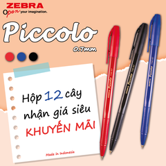 Sản phẩm Zebra rất đa dạng về mẫu mã và chủng loại trong đó có dòng viết bi Piccolo phổ thông. Viết cho cảm giác êm tay, trơn tru, mực ra đều và không lo bị tắc mực. Được sử dụng phổ biến đặc biệt dành cho học sinh và giới văn phòng.