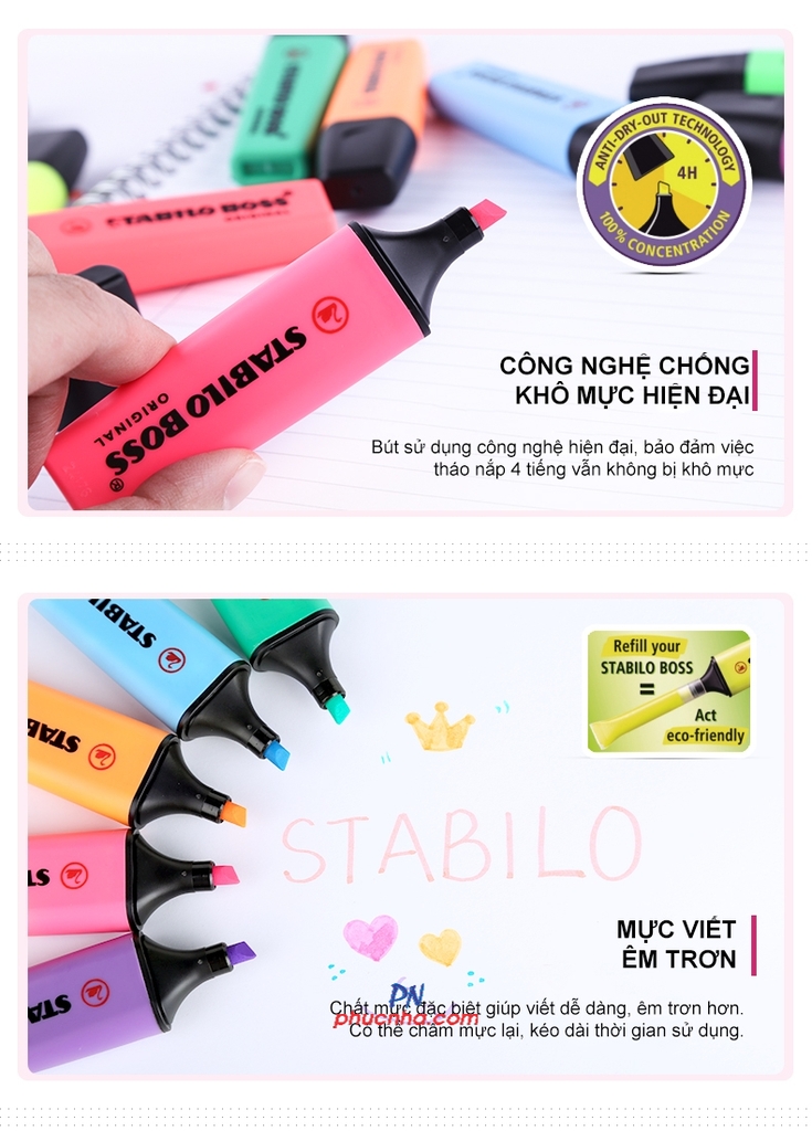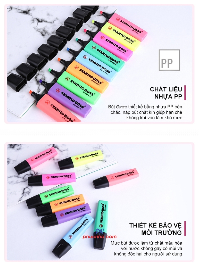 - Bút dạ quang STABILO BOSS ORIGINAL 70 là dòng sản phẩm nổi bật và được yêu thích nhất trên toàn cầu. Với màu mực tươi sáng, rõ ràng, bút giúp làm nổi bật các điểm quan trọng trong tài liệu một cách dễ dàng.