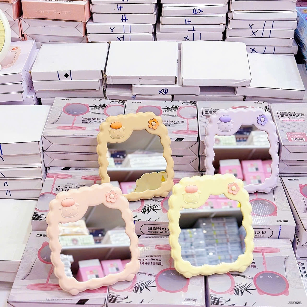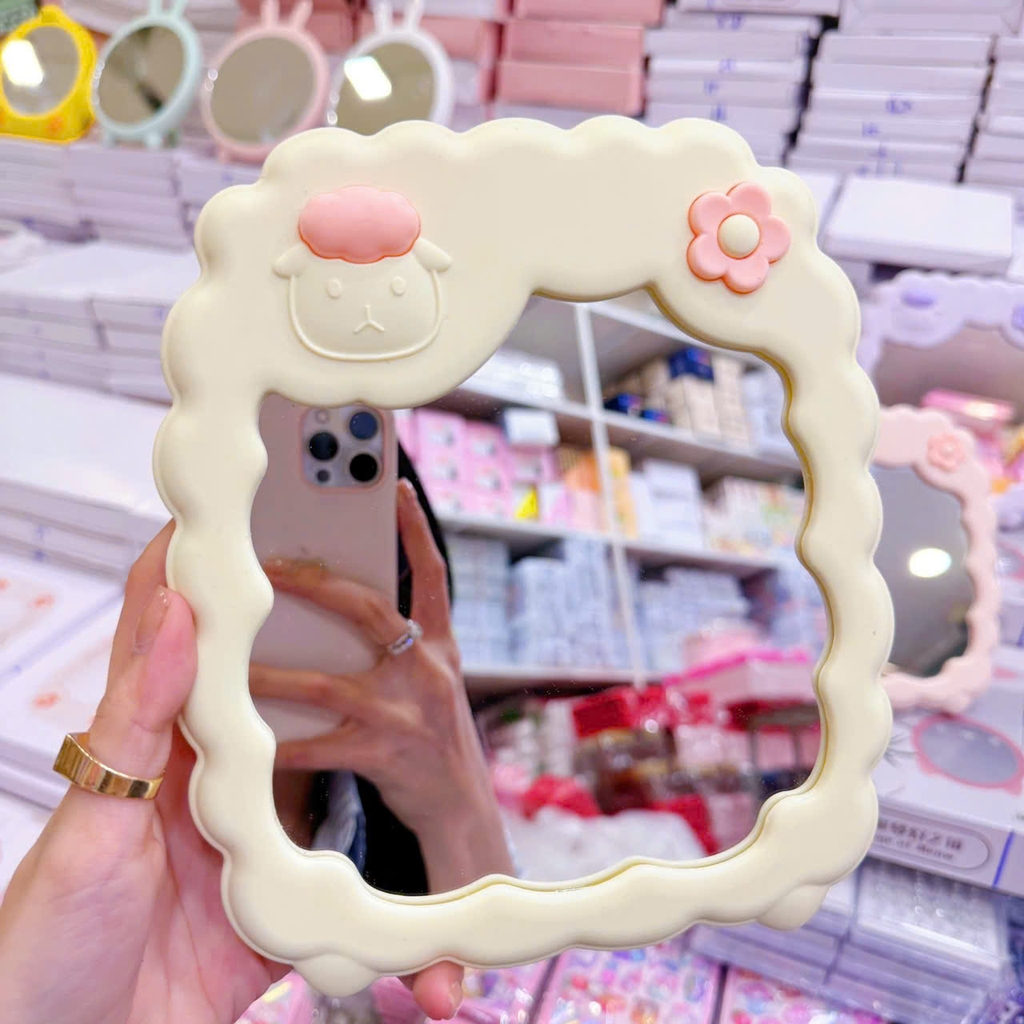 Gương để bàn khung nhựa, cừu hoa cách điệu 20x16.5cm (vàng/hồng/trắng)