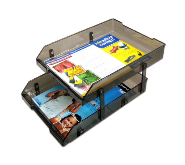 Kệ 2 tầng trượt mica được đặt trên bàn làm việc, có thiết kế đẹp. Các kệ có phần tay cầm kéo ra kéo vào rất thuận tiện.