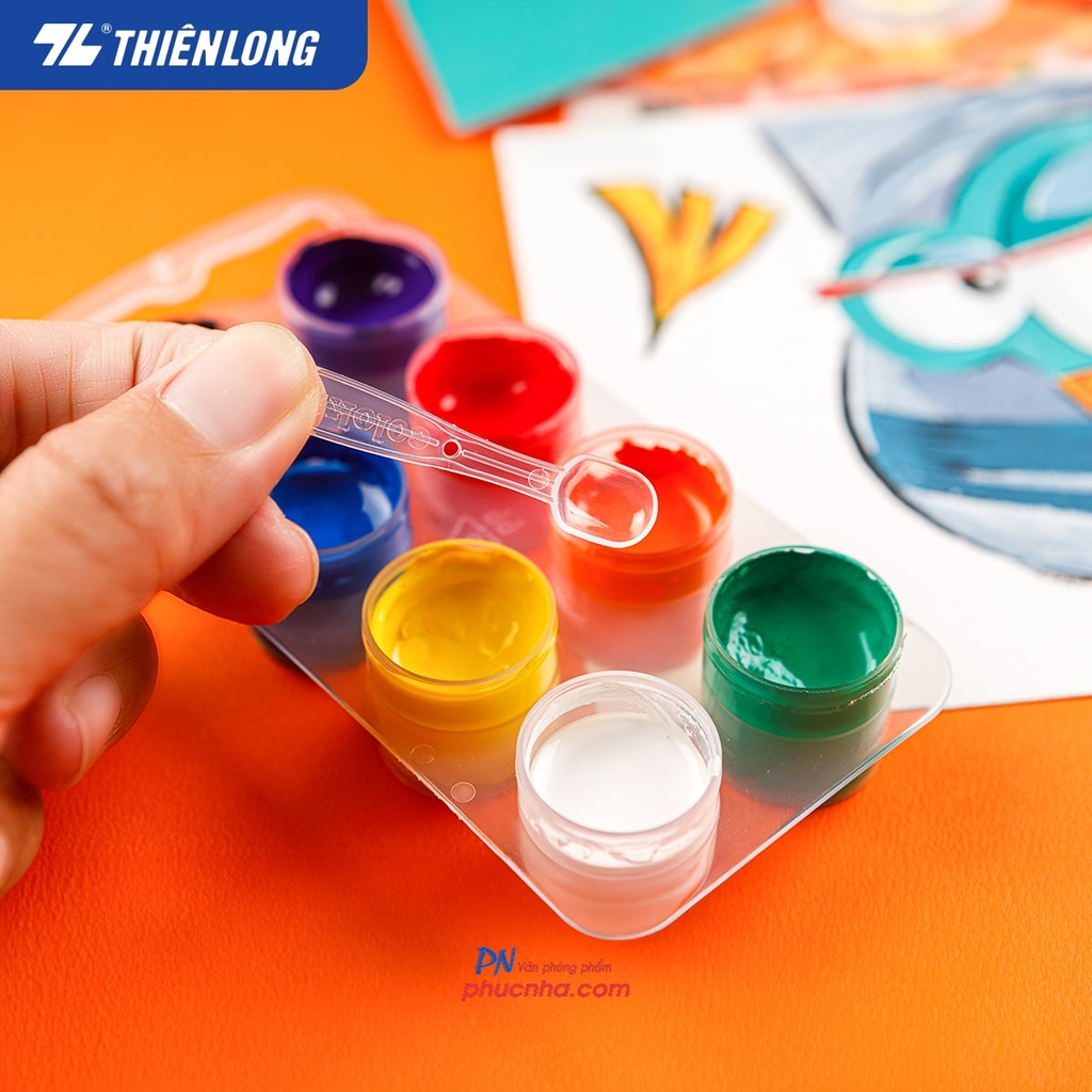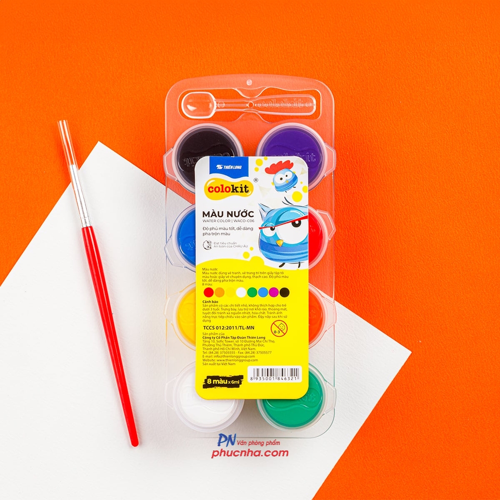 - Màu nước Thiên Long Colokit Waco-C06 là một sự lựa chọn tối ưu cho người sử dụng. Sản phẩm gồm 8lọ đựng kín trong lọ 6ml bằng nhựa trắng trong suốt và có 8 màu sắc khác nhau.